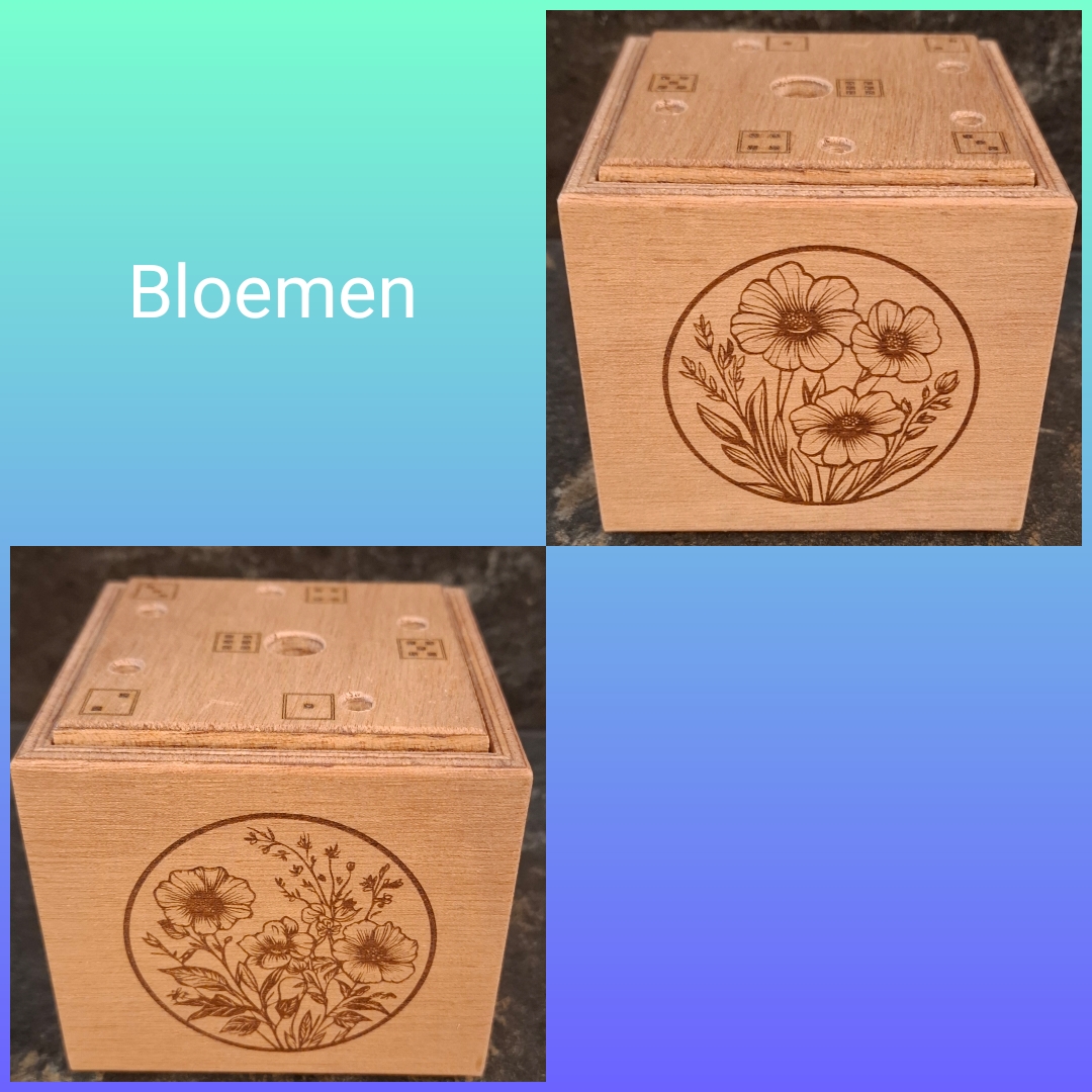 De mormelpot wordt geleverd met ongeveer 40 deuvels, dobbelsteen, spelbeschrijving en bewaarzakje.