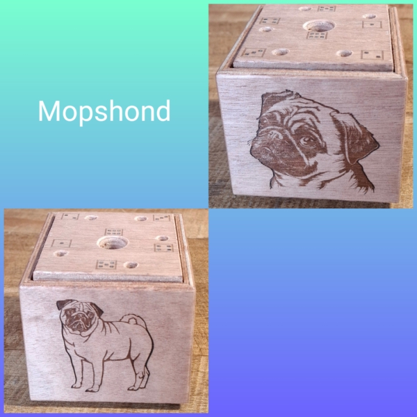 De mormelpot wordt geleverd met ongeveer 40 dokies, dobbelsteen, spelbeschrijving en bewaarzakje.